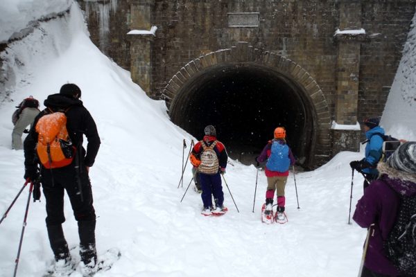 【飯坂温泉駅 集合&解散】スノーシューで旧国道をトレッキング。トンネル跡地にできた『氷の神殿』を見に行く、往復約1時間半のアクティビティです。