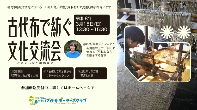そこで、既にすべての工程を継承し、新潟県村上市山熊田で「しな布」の製造・販売を手掛ける大滝ジュンコさんをお招きし、「茂庭のしなだ織」を復興・継承する新たなスタートとしたいと思います。