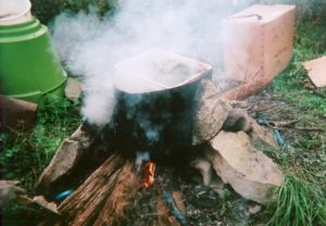 乾燥した皮を今度は1か月程度水に浸け、さらに灰汁と一緒に煮込んで柔らかくします。