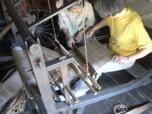 “より”をかけて丈夫にした糸を織機にかけて織ります。